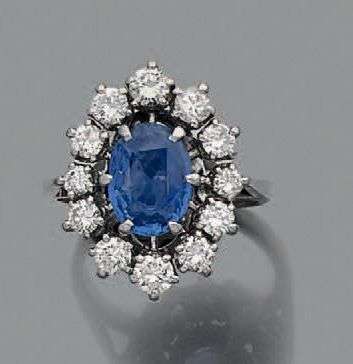 Bague en platine et or gris 18k sertie d'un saphir ovale dans un entourage de diamants de taille brillant.