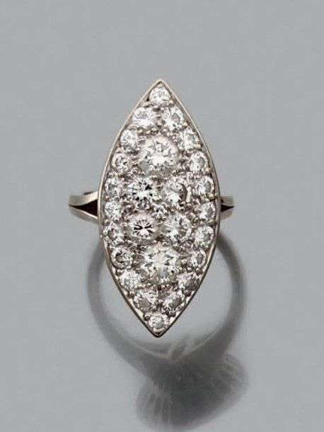 Bague "navette" en or gris 18k sertie d'un pavage de diamants de taille brillant.