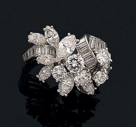 A white gold ring designed with a set of brilliant and marquise-cut diamonds displayed on a baguette-cut diamonds ribbon.