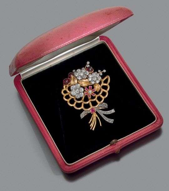 Broche clip "bouquet de fleurs" en platine et or jaune 18k serti de diamants de taille ancienne et taillés en rose, cabochons de grenats et rubis calibrés. Vers 1950