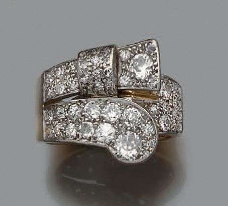 Bague "boucle" en platine et or jaune 18k sertie d'un pavage de diamants de taille ancienne rehaussé de diamants plus importants . Vers 1940
