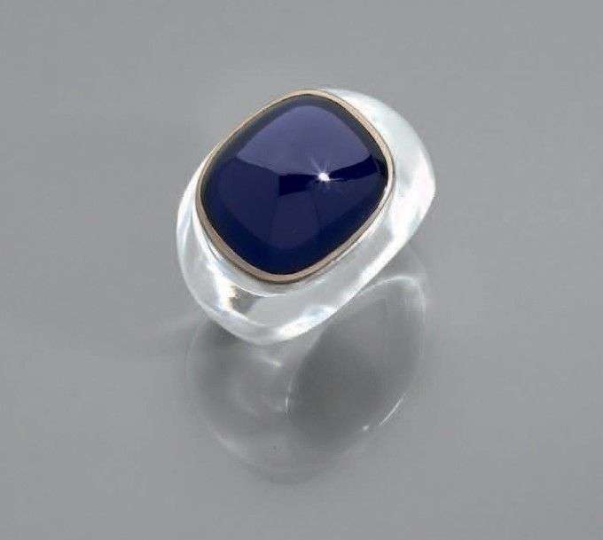 Importante bague en cristal de roche ornée d'un important cabochon de saphir en serti clos sur argent. Vers 1950. Tour de doigt: 56. Pb.: 17.4gr. Accompagnée d'un certificat de Madame Cailles attestant qu'il s'agit d'une création René Boivin
