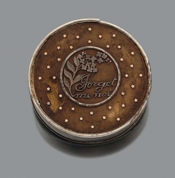 Poudrier rond en argent composé d'un fond en bois appliqué d'une branche de fleurs en argent et du message "Forget me not" dans un entourage d'étoiles en or jaune. Signé