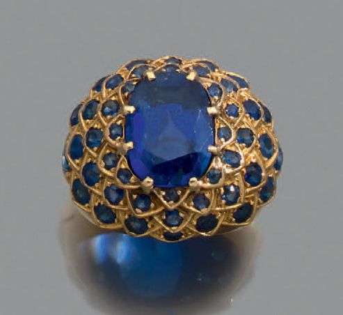 Bague "boule" en or jaune 18k sertie d'un beau saphir ovale dans un entourage écaille serti de saphirs. Vers 1950. Tour de doigt: 50. Pb.: 12.4gr. Accompagnée d'un certificat du LFG N° 319257 précisant / Poids du saphir: 5.72 carats, Origine: Sri Lanka, Pas de modification thermique constatée