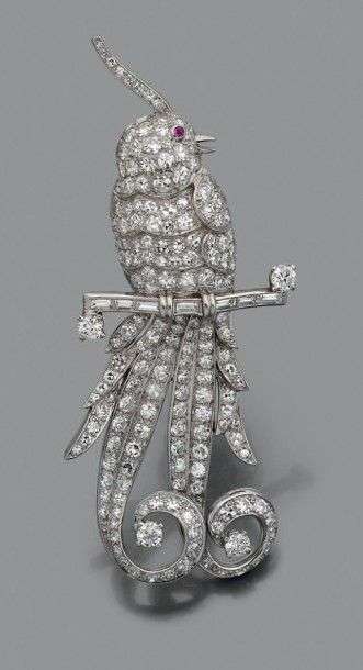 A platinum and white gold "bird on branch" brooch set with brilliant-cut diamonds, 88-cut diamonds and a row of baguette-cut diamonds for the branch. A ruby cabochon for the eye.