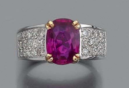 Bague en or gris et jaune 18k sertie d'un rubis coussin épaulé de deux pavages de brillants.