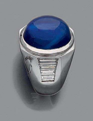 Bague "chevalière" en platine à pans coupés sertie d'un important saphir cabochon épaulé d'une chute de diamants baguettes. Dans un écrin Van cleef and Arpels. Trace de signature.