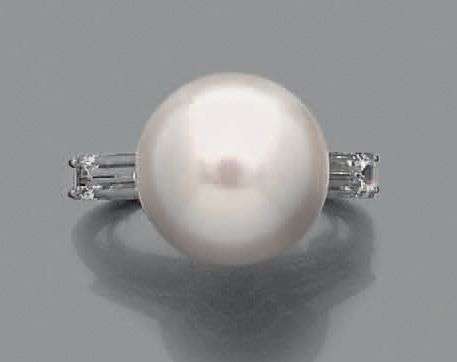 Bague en platine sertie d'un importante perle de culture épaulée de deux diamants baguettes.
