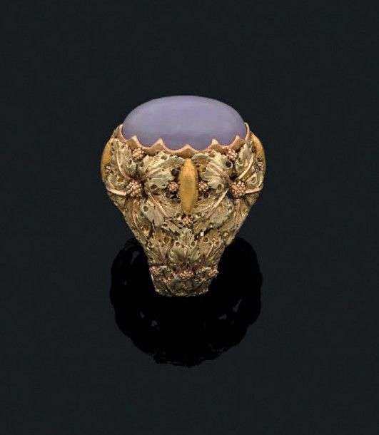 Importante bague en or jaune, vert et rose 18k ciselée de fleurs et sertie au centre d'un jade lavande. Signée