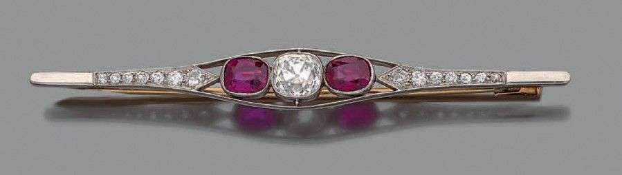 A platinum brooch set with an ancient-cut diamond and two rubies enhanced with a row of diamonds.