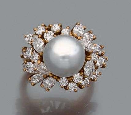 Bague en or jaune 18K sertie d'une perle de culture dans un bel entourage de diamants de taille brillant et navette.