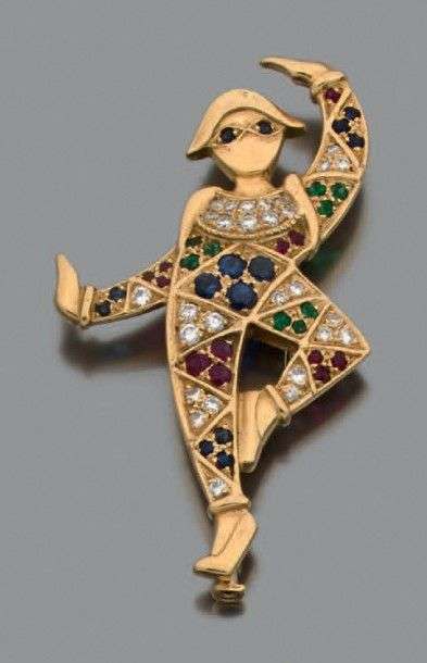 Clip "Arlequin" en or jaune 18k serti de diamants de taille brillant, saphirs, émeraudes et rubis. Signé