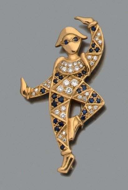 Clip "Arlequin" en or jaune 18k serti de diamants de taille brillant et saphirs. Signé
