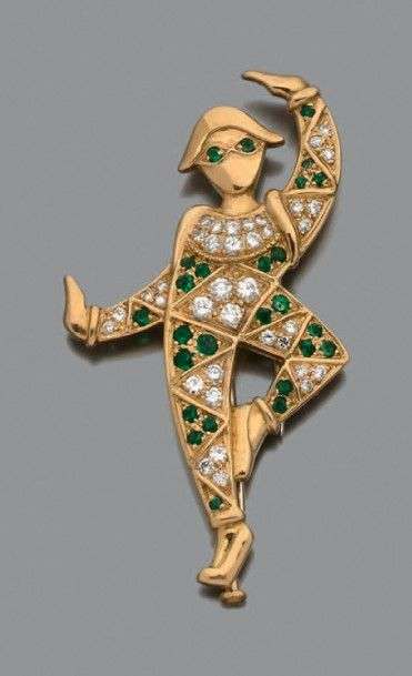 Clip "Arlequin" en or jaune 18K serti de diamants de taille brillant et d'émeraudes. Signé