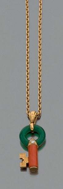 Pendentif "clef" en or jaune 18k orné de chrysoprase et corail rehaussé d'un diamant. Signé et numéroté.