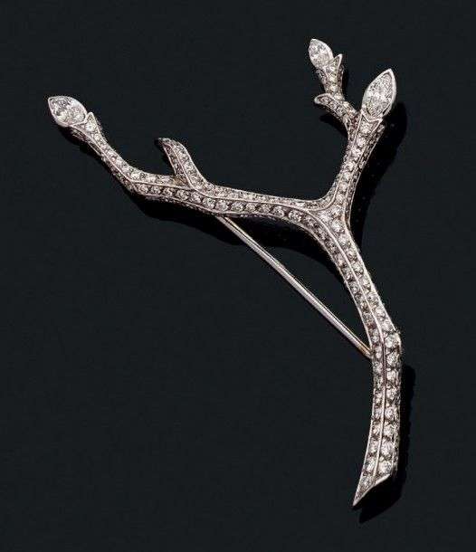 A white gold branch-shaped brooch set with brilliant-cut diamonds and some baguette-cut diamonds.