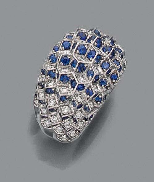 A white gold ring paved with brilliant-cut diamonds and sapphires on the sides.
