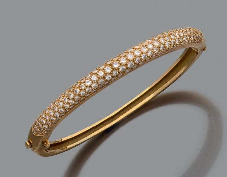 A yellow gold bangle with diamonds paving.