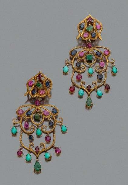 Paire de grands pendants d'oreilles "girandoles" en or jaune 14k ciselés de volutes retenant en pampille des saphirs, rubis, émeraudes et turquoises.