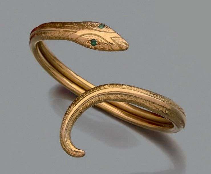 A yellow gold snake-shaped bangle, enhanced with emeralds for the eyes.
