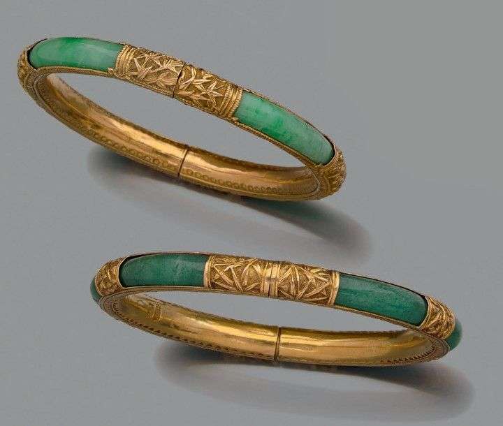 Paire de bracelets en or jaune 18k ciselé à décor de fleurs et orné de motifs de jade.
