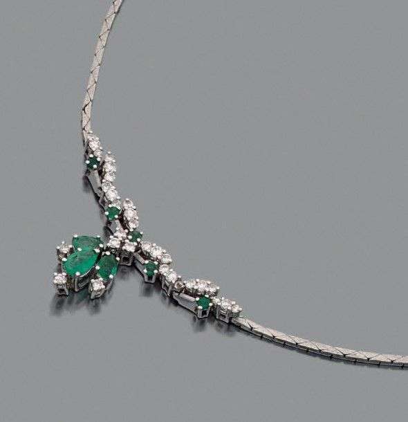 Collier or gris 18k orné d'un motif central serti de diamants de taille brillant et d'émeraudes de taille poire et brillant.