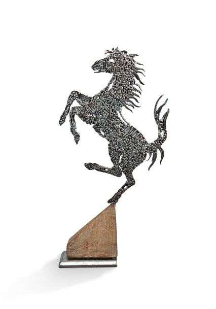 Sculpture représentant le cheval cabré Ferrari, réalisée à partir de vis et d'écrous