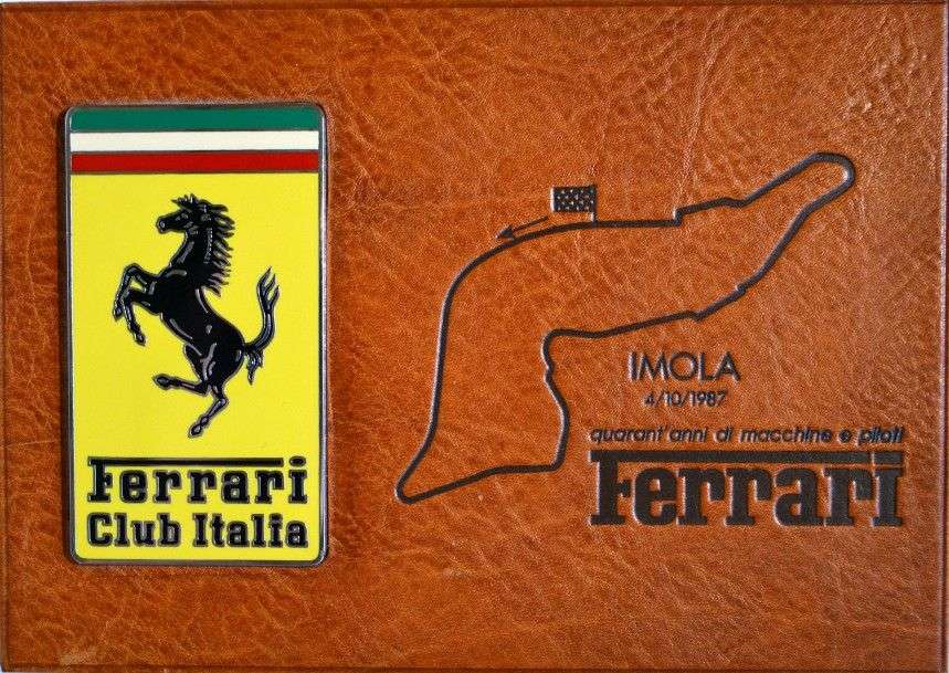 Plaque émaillée du Club Italia Ferrari sur socle en cuir Schedoni, pour le 40ème anniversaire de Ferrari à Imola en 1987