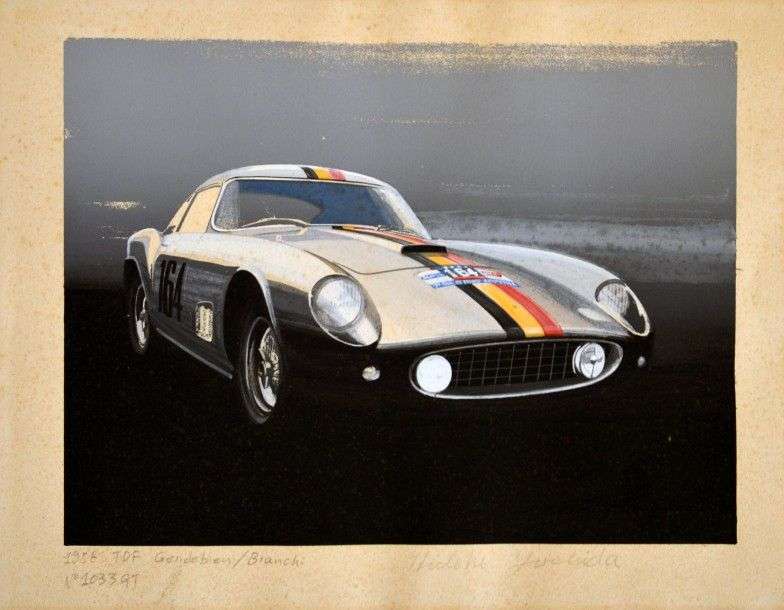 Gouache représentant la FERRARI 250 GT Tour de France (TDF), N°1033GT de 1958, au 7ème Tour de France Automobile, de l'équipage Gendebien/Bianchi, concurrent N°164