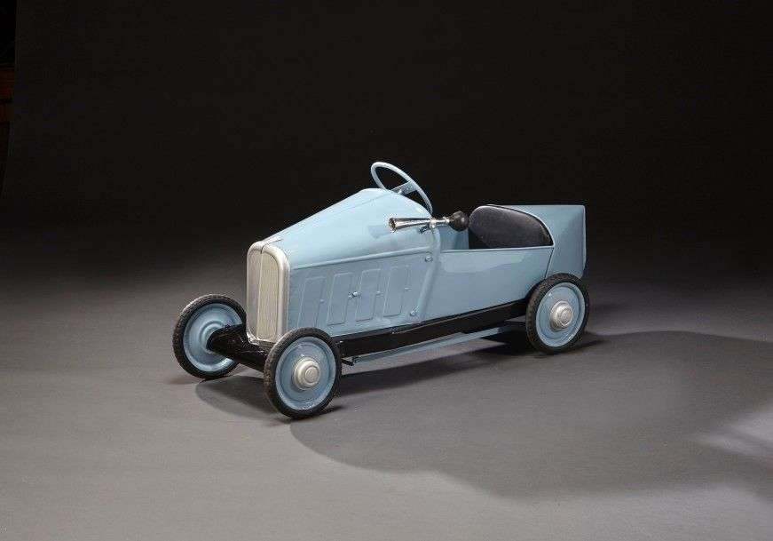 Voiture à pédales RENAULT à cul de poule, en tôle bleue et noir