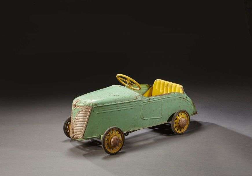 Voiture à pédales de type TORPEDO en tôle verte et jaune. Etat d'origine