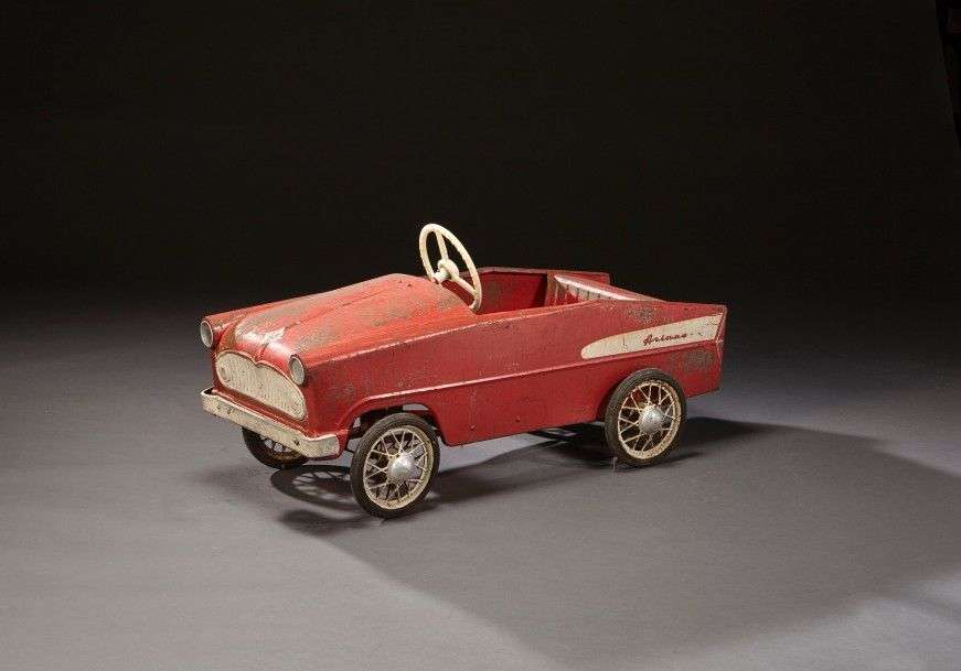 Voitures à pédales SIMCA ARIANE en tôle rouge. Roues blanches