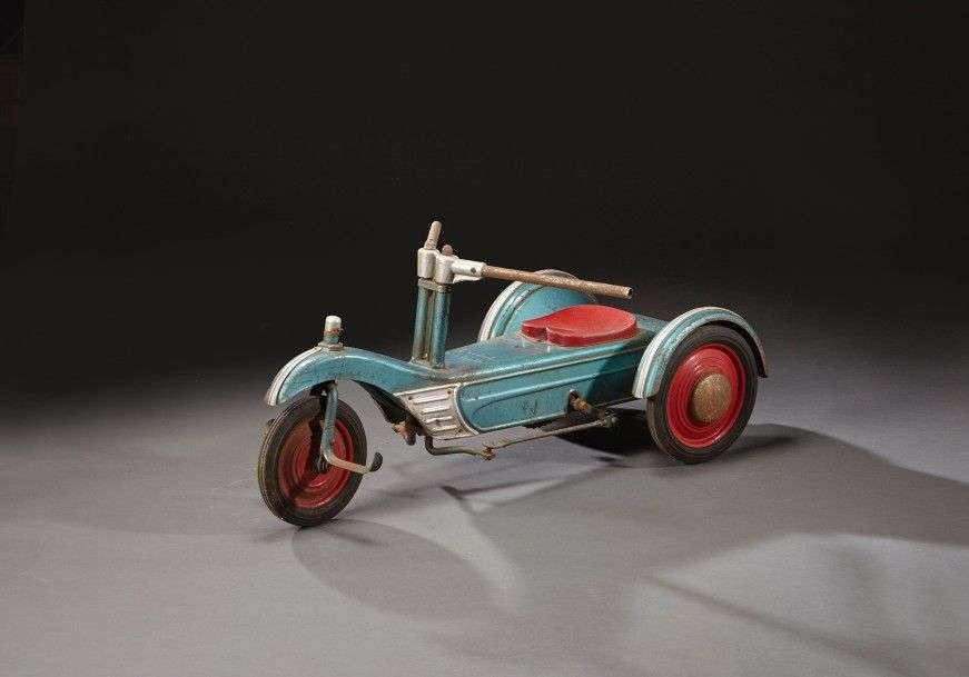 Tricycle profilé CYCLORAMEUR d'enfant en tôle bleue avec selle et roues de couleur rouge. Très bon état d'origine
