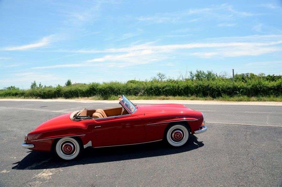 Américaine d'origine, cette 190 SL a bénéficié en 2011 d'une restauration sérieuse réalisée par le spécialiste Company Euro Classic Auto Restoration, en Californie. Depuis, elle n'a parcouru que 2 400 km. Sa peinture blanche d'origine a laissé place à une très belle couleur «Feuerwehr Rot», remarquablement bien appliquée.