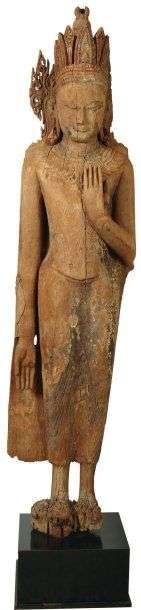 Un rare et important buddha de l'ancien royaume de Pagan. Des arts du monde indianisé de haute époque, celui de Pagan qu'on se doit pourtant de considérer comme majeur, demeure un des moins connus des amateurs occidentaux, probablement à cause de la rareté des pièces dans les collections tant publiques que privées. C'est au 1I° siècle, depuis sa capitale de Pagan, que le roi Anawrahta (1044-1077) converti au bouddhisme theravâda (probablement par des moines Môn) parvient à faire l'unité de la Birmanie. Dès lors, sa capitale et son royaume vont se couvrir de centaines de fondations bouddhiques. Pour des raisons géographiques évidentes, peintures et sculptures y seront fortement influencées par l'art des dynasties Pâla et Sena, qui se succéderont dans l'Inde du nord-est voisine. Le royaume de Pagan ne put résister aux raids Mongols et quasiment anéanti en 1287, les descendants de la dynastie ne purent maintenir un semblant de monarchie que quelques décennies encore. Le grand Buddha de la collection de Kenzo peut être considéré comme une des plus parfaites expressions de cet art de Pagan du temps de sa splendeur. Il est figuré debout, la main gauche ramenée devant la poitrine maintenant un plis de son costume, la droite à la paume tournée vers l'avant en varada-mudrâ pour répandre des faveurs. Il est richement paré et couronné pour l'identifier comme le plus grand des monarques, suivant une iconographie courante dans les archétypes Pâla. Toutefois, le traitement particulier des bijoux et de la tiare et de ses ornements latéraux se répandant au dessus des épaules est totalement caractéristique d'une réinterprétation locale du modèle indien. Les sculptures de ce style proche des archétypes sont généralement datées du 13° siècle, et ont essentiellement dû leur survie à la tradition de les exécuter en teck. Celui-ci présente encore des restes des couches de laque rouge qui la recouvrait originellement. Myanmar. (Birmanie) H. : 198 cm Pour deux exemples stylistiquement légè