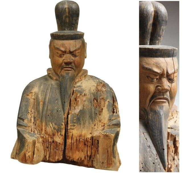 Superbe et important buste de Tenjin. "Tenjin" est en fait l'abréviation de Tenman Daijizai Tenjin, titre divin attribué à Sugawara no Michizane (845-903), illustre homme d'état, savant et artiste disgracié et exilé à priori à tort. Il fut d'abord considéré comme un esprit rancunier et farouche qu'il fallait se ménager, et donc considéré comme un kami particulier, avant d'être honoré et vénéré comme la divinité de la poésie, non seulement à Kyoto, mais rapidement dans tout le Japon. Il est intéressant qu'à ce titre, il est autant vénéré dans les sanctuaires Shinto que bouddhistes Zen. Ce serait essentiellement durant la fin de l'époque des dynasties du Sud et du Nord (1333-1392), et au début de l'époque de Muromachi que la dévotion envers Tenjin connut son plus important développement dans les monastères Zen. Avec la puissante expression de son visage au réalisme exacerbé, cette remarquable sculpture peut justement être datée de la période de Muromachi, et être considérée comme un des archétypes du genre. Bois de Hinoki peint. H. : 61 cm. Japon.