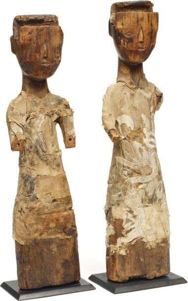 Rare couple de figurines funéraires, mingqi, en bois. Les visages sont traités dans le style minimaliste caractéristique de la période. Une cavité pratiquée sur le haut des fronts a autrefois dû servir à fixer des chevelures postiches. Les deux figures sont recouvertes de pièces de soie brodées d'animaux mythiques.(petits accidents et manques visibles) Chine, Royaume de Chu (époque dite des Royaumes Combattants), 4° - 3° siècles avant notre ère. H. : 45 et 46,5 cm. Provenance : Acquis de la Galerie Jacques Barrère (Paris) en 1998. Reproduit au catalogue de l'exposition "Bois d'Immortalité" Galerie Barrère 1998, pages 52 - 53 Les documents émis à l'époque par la Galerie Barrère seront remis à l'acquéreur.