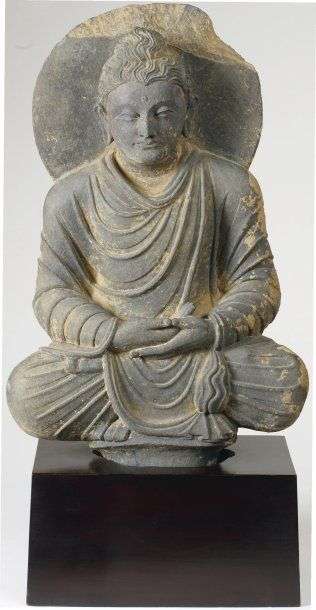 Buddha en méditation. Assis dans l'attitude du lotus, vajraparyañka, les mains faisant le geste symbolisant la méditation, dhyâna-mudrâ, le Buddha est vêtu d'un costume au drapé classique, sa tête étant adossée à un nimbe circulaire. Outre le remarquable achèvement sculptural de cette oeuvre qui l'inscrit dans le grand classicisme gandhârien, on notera la belle qualité de schiste "gris-bleu" qui caractérise les pièces issues des meilleurs ateliers, et surtout, encore présents dans de nombreux endroits, des restes des feuilles d'or qui originalement avaient dû la recouvrir entièrement. La partie inférieure de l'image est taillée en forme de tenon qui servait initialement à emboîter l'image sur un socle lotiforme. Les oeuvres de ce style classique sont généralement datées entre les 2° et 4° siècles de notre ère. H. : 54 cm