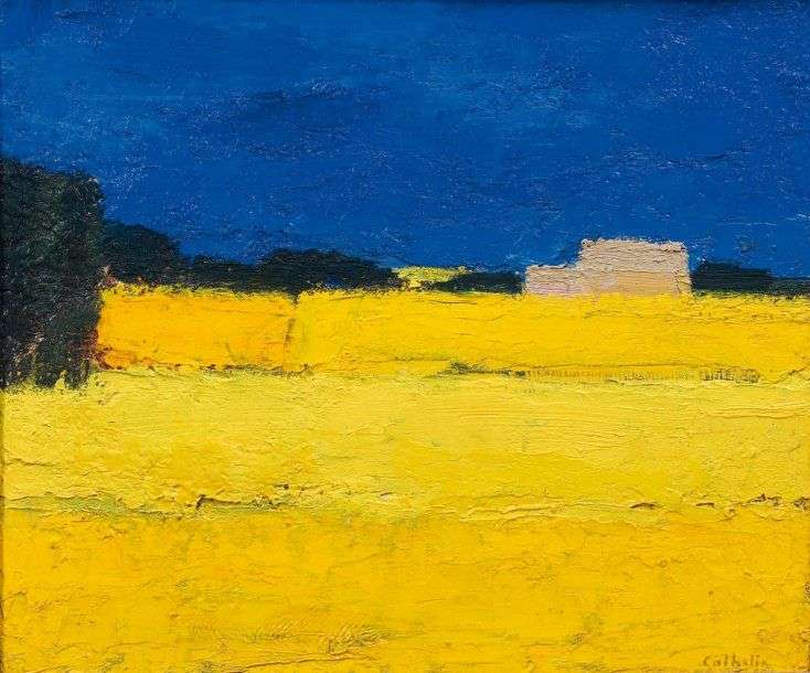 Paysage, ferme au champs de colza (Ombrie) Huile sur toile, signée en bas à droite et datée 1996. 44 x 55 cm
