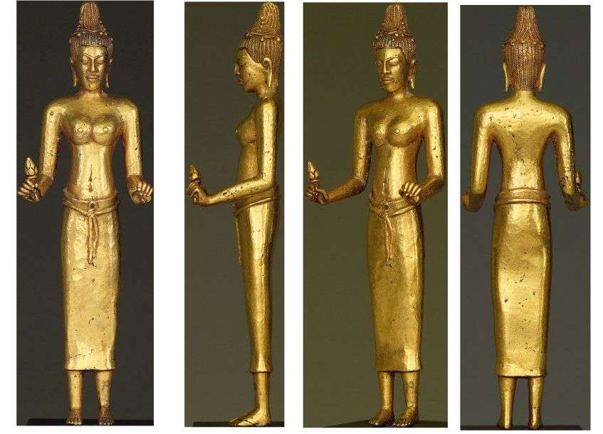 Exceptionnelle représentation en or d'une divinité féminine debout tenant une fleur de lotus de la main gauche, et une tablette ou un livre dans la gauche. Son visage renvoie globalement à l'esthétique de Dvâravatî, et est surmonté d'une superbe coiffurenattée, au retombant sur les cotés du mukuta vertical. Sa taille est ceinte d'un long sarong maintenu par un simple lien suivant la mode attestée en Thaïlande et au Cambodge durant les 7° et 8° siècles. Outre ses qualités esthétiques indéniables et son absolu classicisme, le caractère remarquable de cette oeuvre est également lié à son matériau, et surtout à sa dimension qui en fait une des plus grandes oeuvres de ce type en ce matériau recensé à ce jour. Il pourrait paraître surprenant qu'une image de cette importance soit dédiée à une divinité féminine plutôt qu'à un buddha ou à une des figures majeures de la trinité hindoue. Toutefois la présence d'un livre dans la main gauche de cette déesse pourrait nous inciter à l'identifier comme étant Prajñâpâramitâ ou "perfection de la sagesse", dont le sûtra connut une popularité extraordinaire dans tout le monde bouddhique. Cette identification prestigieuse pourrait justifier qu'un souverain ait pu commanditer une telle image. L'esthétique générale de l'oeuvren'est pas sans évoquer certaines plaques d'or décorées au repoussé de divinités en pied ou en buste, traditionnellement considérées comme provenant de Si Thep sur le territoire actuel de la Thaïlande, et permet de proposer une datation, quelle qu'en puisse être l'origine précise, aux alentours du 8° siècle. H. : 23 cm L'objet est accompagné d'une analyse établie par Conservation & Technical Services Ltd, Birbeck College, de Londres, n° 90660 en date du 3 février 1996, attestant que l'objet est conforme à ce qu'on peut attendre d'un or pré-angkorien, tant sur le plan du matériau que de la technique, et que son poids en or s'élève à 609 grammes.