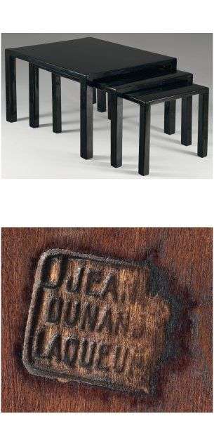 Jean DUNAND (1877-1942) Suite de trois tables gigognes en bois laqué noir reposant sur un piètement de section carrée. Signée du cachet : Jean Dunand laqueur. Dimensions de la table (grande) : H : 41 cm - L : 70 cm - l : 58,5 cm Dimensions de la table (intermédiaire) : H : 37,5 cm - L : 70 cm - l : 48,5 cm Dimensions de la table (petite) : H : 34 cm - L : 70 cm - l : 39,5 cm Expert : Arnaud Plaisance + 33 6 10 49 83 38