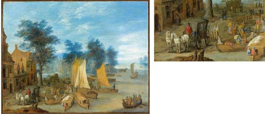 Déchargement des marchandises dans un port un port fluvial Panneau de chêne parqueté 24 x 31 cm Porte une signature et une date en bas à gauche Brueghel 16... Provenance : Acquis auprès de la galerie Finck par les propriétaires actuels dans les années 1960 comme Brueghel