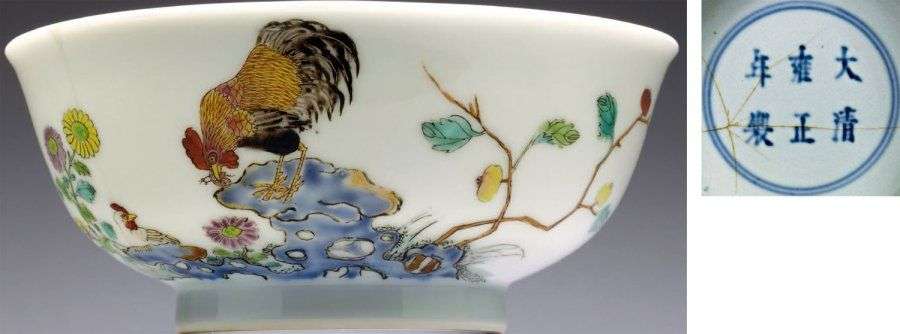 Bol circulaire décoré sur la paroi exterieure en émaux de la famille rose d'un coq et d'une poule perchés sur un rocher percé d'ou s'échappent des branches fleuries. Il porte au revers une marque de règne YONGZENG à six caractères en bleu sous couverte dans un double cercle. Marque et periode YONGZENG (1723-1735) (un cheveu et un morceau recollé) Diam. 12 cm