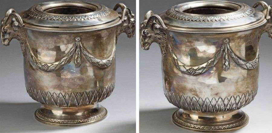 Paire de rafraichissoirs en argent posant sur pièdouche à décor de feuilles d'eau. La partie basse du corps en forme de feuilles de laurier. Anses en formes de tête de bélier en argent fondu et ciselé, rejointent sur le corps par deux guirlandes feuillagées. Interieur formant cale bouteille en argent. Poinçon minerve. Orfèvre : A une étoile à cinq branches et une autre lettre (illisible). (légers chocs) Poids net total : 2540 g et 2505 g