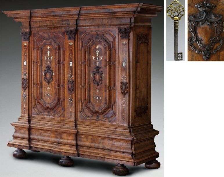 Belle et importante armoire en placage de noyer marqueté en feuilles à décor de dessins géométriques. Elle ouvre par deux portes. Les côtés, les portes, le dormant et les montants à réserve en relief, ondé, à décor de chapiteaux corinthien et d'écussons en noyer, encadrés de guirlandes de fleurs et feuillages et surmontés d'une couronne. Incrustation d'ivoire gravé à décor de bouquets de fleurs, personnages ou animaux. Base et fronton débordant. Pieds patins Avec sa clé en fer et bronze Travail rhénan, du milieu du XVIIIe siècle H. 256 - L. 240 - P. 97 cm