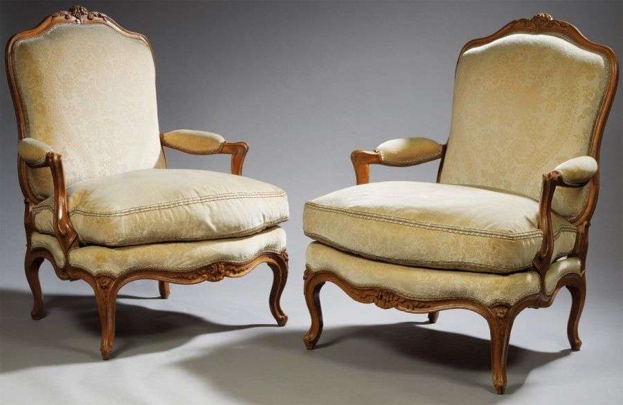 Paire de larges fauteuils à dossier plat à la Reine, en hêtre mouluré et sculpté de fleurettes et feuillages. Les supports d'accotoir, nervurés. Ceintures chantournées. Dés à fleurettes. Petits pieds cambrés à enroulement Estampille de AVISSE Epoque Louis XV (légers éclats dans les hauts de pied et quelques rebouchages) Garniture en velours frappé beige H. 104 - L. 78 - P. 70 cm AVISSE (Jean) reçu Maître le 10 Novembre 1745