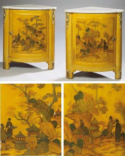 Superbe paire d'encoignures en laque européen, dite "jonquille". Elles sont de forme galbée, présentant en plein un décor polychrome de chinoiseries, illustré par des personnages dans des perspectives paysagées de pagodes et de montagnes, animées d'oiseaux. Les montants légèrement arrondis. Chutes, sabots et entrées de serrure, de bronze ciselé et doré à décor en console de guirlandes de feuilles de laurier, rosaces et cannelures Attribuées à RUBESTUCK Epoque Louis XVI (légers éclats à la laque) Plateaux de marbre blanc veiné gris H. 89 - L. 72 - P. 49,5 cm Encouragée par certains amateurs et sous l'impulsion des marchands-merciers, l'ébénisterie parisienne se diversifia considérablement dans le premier tiers du XVIIIe siècle. Les artisans, alors habiles dans la réalisation de meubles en placage ou en marqueterie de métal ou de bois fruitiers, durent s'adapter à la vogue qui gagna la capitale en ce temps là pour tout ce qui venait d'Orient, principalement de la Chine et du Japon. Ils revêtirent leurs meubles de panneaux de laque, provenant essentiellement de cabinets ou de paravents, ayant la plupart du temps un fond noir. Rapidement, ces panneaux furent concurrencés directement par une création purement française dont la paternité semble revenir aux célèbres frères Martin : le vernis européen. Ce type de vernis permit dans un premier temps d'imiter les laques orientales, aussi bien dans le décor que dans les tonalités, puis au fil du temps, les peintres vernisseurs élaborèrent de nouvelles teintes souvent pour répondre à des commandes précises. C'est ainsi que des meubles à décor bleu, vert, rouge ou jaune sortirent de certains ateliers d'artisans en meubles de la capitale. La paire d'encoignures proposée présente cette singularité qui en fait sa rareté, elle est ornée d'un délicat verni fond jaune que l'on peut aussi qualifier de « jonquille » ou de « camomille ». Au XVIIIe siècle, les mentions de ce type de meubles sont rarissimes, mais permettent de connaître le