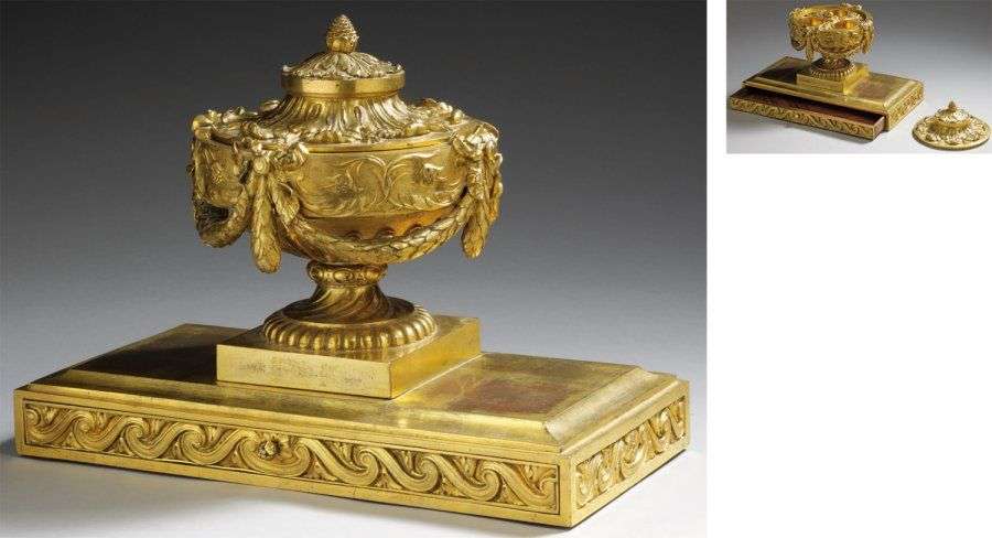 Ecritoire de bureau en bronze ciselé et doré (reprises). Elle présente un vase à l'Antique à guirlandes de feuilles de laurier rubanées, soulignant une frise de rinceaux. Au centre le couvercle à feuilles d'acanthe et graine, découvre les encriers ou sablier, ornés de feuilles d'acanthe. Entablement rectangulaire à doucine, à frise de postes, en ceinture Epoque Louis XVI H. 23 - L. 30 - P. 15 cm