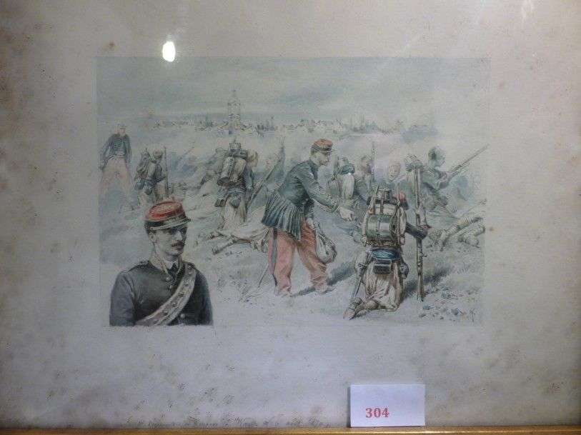 «1er Régiment de Zouaves à Woerth (6 août 1870)» Aquarelle, monogrammée en bas à droite. Sous verre. Cadre doré. 13,5 x 19,5 cm