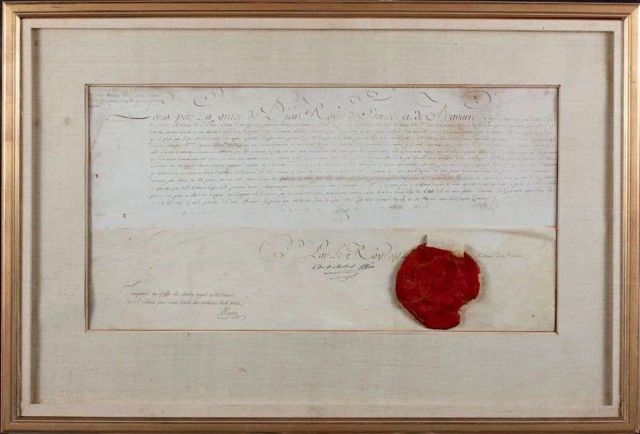 «Louis par le Grâce de Dieu Roy de France et de Navarre» Diplôme de nomination de Commandeur de l'Ordre Militaire de Saint Louis, au nom du Sieur Jean Baptiste Joseph Damas Sahuguet Bon d'Espagnac, Maréchal de Camp en nos Armées, Gouverneur de notre Hôtel Royal des Invalides. Donné à Versailles, le 1 mars 1769. Signature Louis (secrétaire), le Duc de Choisel et Marie Garde des Archives de l'Ordre. Sceau à la cire rouge (accidents). Sous verre. Cadre doré. 37 x 71 cm à vu. D'Espagnac Baron, (1713-1783) Gouverneur des Invalides de 1766 à 1783.